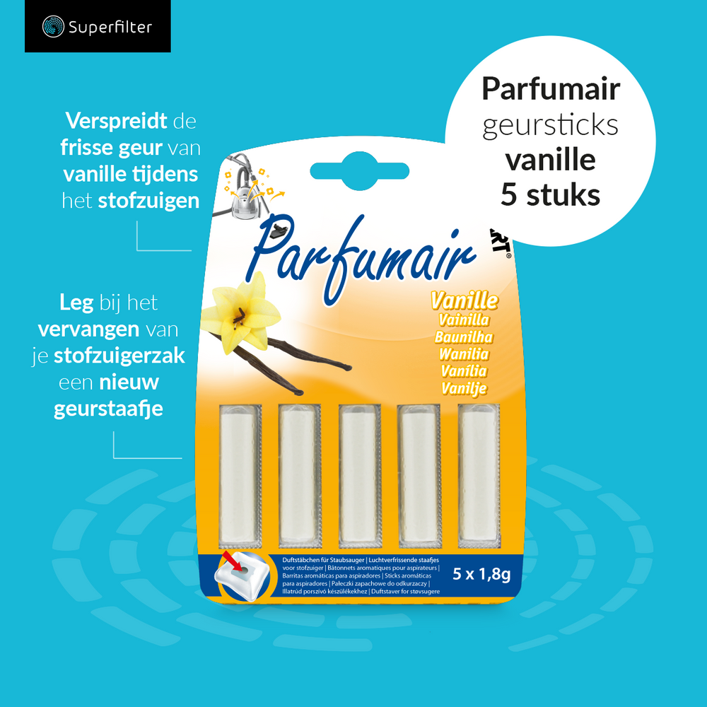 Leg een geurstaafje in je nieuwe stofzuigerzak en geniet van de warme, zoete geur van vanille tijdens het stofzuigen. De vanille geurstaafjes camoufleren de onprettige geur van uitgeblazen stof, zodat je stofzuigbeurt aangenaam ruikt. Eén staafje gaat ongeveer een maand mee.