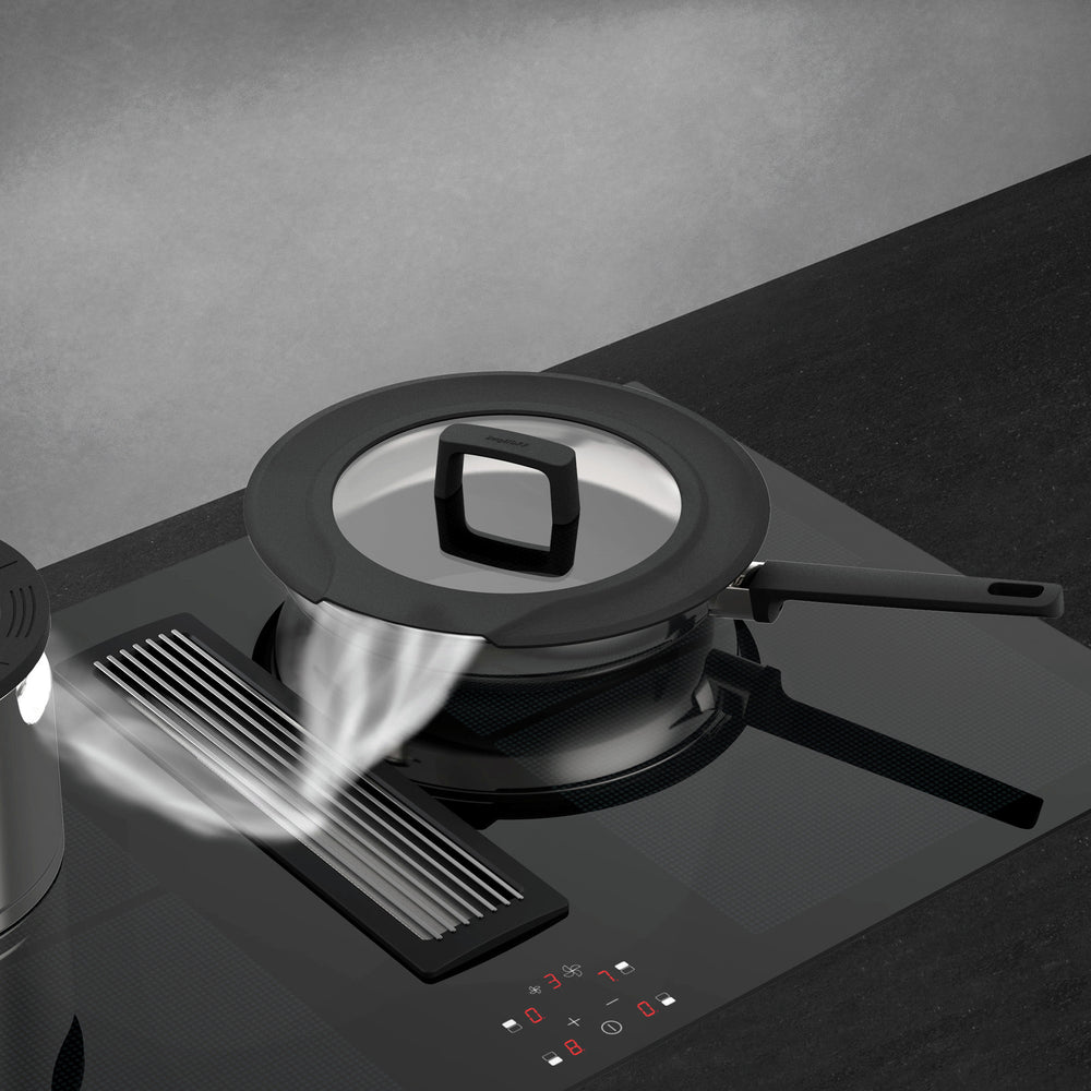 Glazen deksel met luchtkanalen: Het deksel bevat geïntegreerde luchtkanalen die zorgen voor een optimale stoomafvoer, wat voorkomt dat geuren in de keuken blijven hangen.